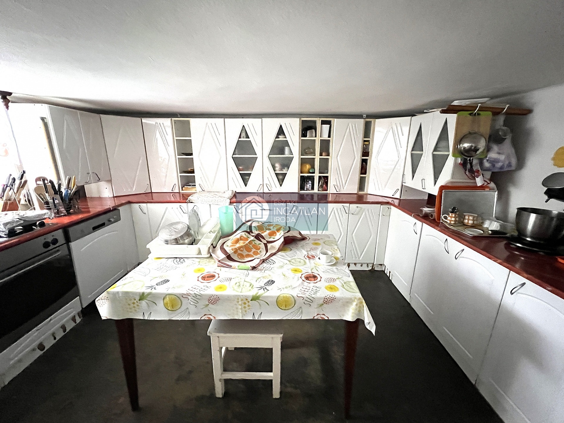Az alsó szinten egy teljesen felszerelt és tágas főzőkonyha kapott helyet és egy étkező (kb. a felső szint felén), amely ideális nagyobb családi összejövetelekhez, vagy akár külön lakrész kialakításához is. A további részek kiválóan alkalmasak tárolásra, barkácsolásra.
